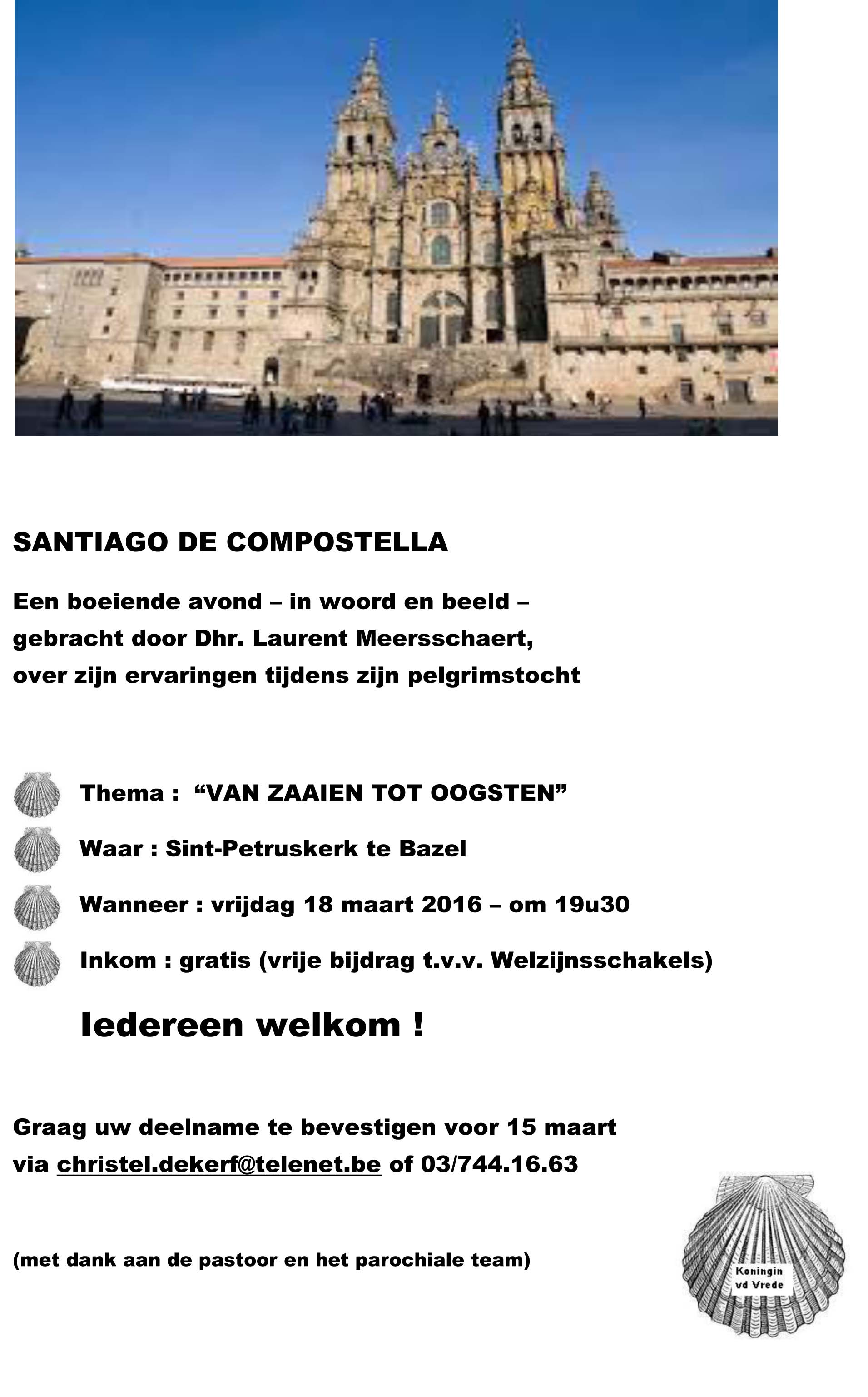 Een boeiende avond – in woord en beeld – gebracht door Dhr. Laurent Meersschaert, over zijn ervaringen tijdens zijn pelgrimstocht Thema : “VAN ZAAIEN TOT OOGSTEN” Waar : Sint-Petruskerk te Bazel Wanneer : vrijdag 18 maart 2016 – om 19u30 Inkom : gratis (vrije bijdrag t.v.v. Welzijnsschakels) Iedereen welkom ! Graag uw deelname te bevestigen voor 15 maart via christel.dekerf@telenet.be of 03/744.16.63